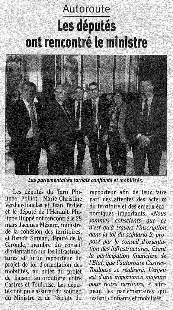 Les députés du Tarn Philippe Folliot, Marie-Christine Verdier-Jouclas et Jean Terlier et le député de l’Hérault Philippe Huppé ont rencontré le 28 mars Jacques Mézard, ministre de la cohésion des territoires, et Benoît Simian, député de la Gironde, membre du conseil d’orientation sur les infrastructures et futur rapporteur du projet de loi d’orientation des mobilités, au sujet du projet de liaison autoroutière entre Castres et Toulouse.