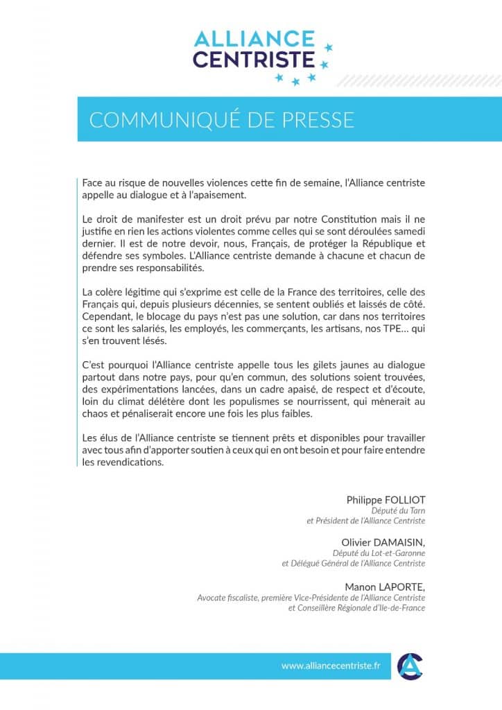C’est pourquoi l’Alliance centriste appelle tous les gilets jaunes au dialogue partout dans notre pays, pour qu’en commun, des solutions soient trouvées, des expérimentations lancées, dans un cadre apaisé, de respect et d’écoute, loin du climat délétère dont les populismes se nourrissent, qui mènerait au chaos et pénaliserait encore une fois les plus faibles.