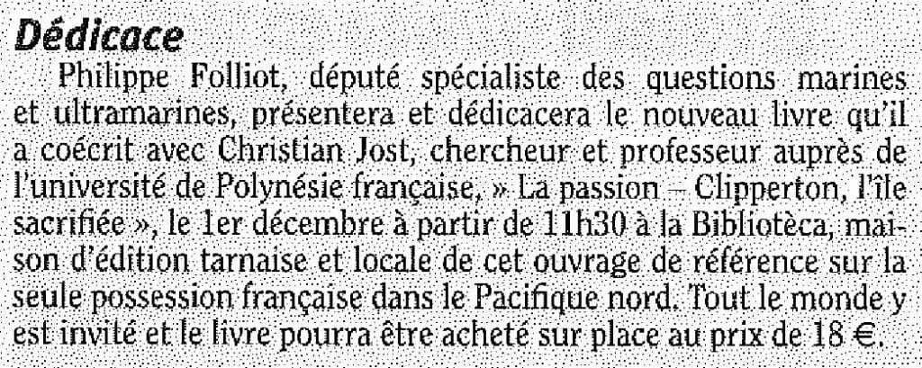 Nous sommes le 21 novembre, jour officiel de mise en vente du livre « La Passion – Clipperton, l’île sacrifiée » ! Philippe FOLLIOT, député du Tarn spécialiste de questions marines et ultramarines, s’est associé à Christian JOST, chercheur et professeur à l’Université de Polynésie Française, afin de rédiger un ouvrage référence sur la seule possession Française dans le Pacifique-nord.